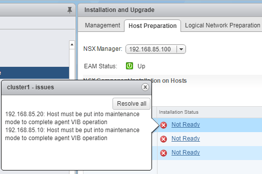 If the hosts are not in maintenance mode, you will see the Not ready error appear.