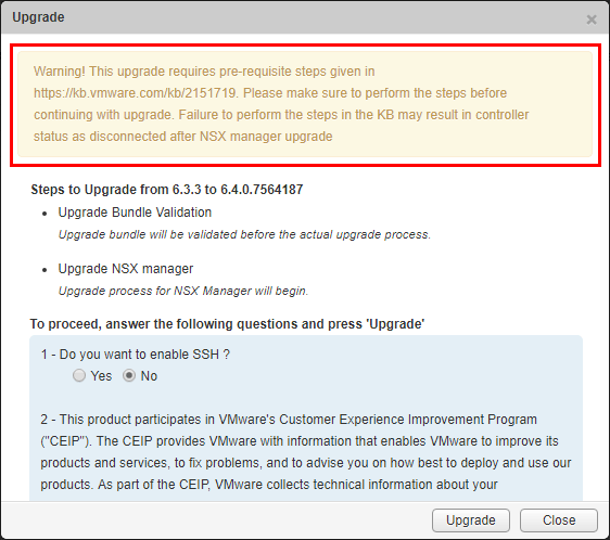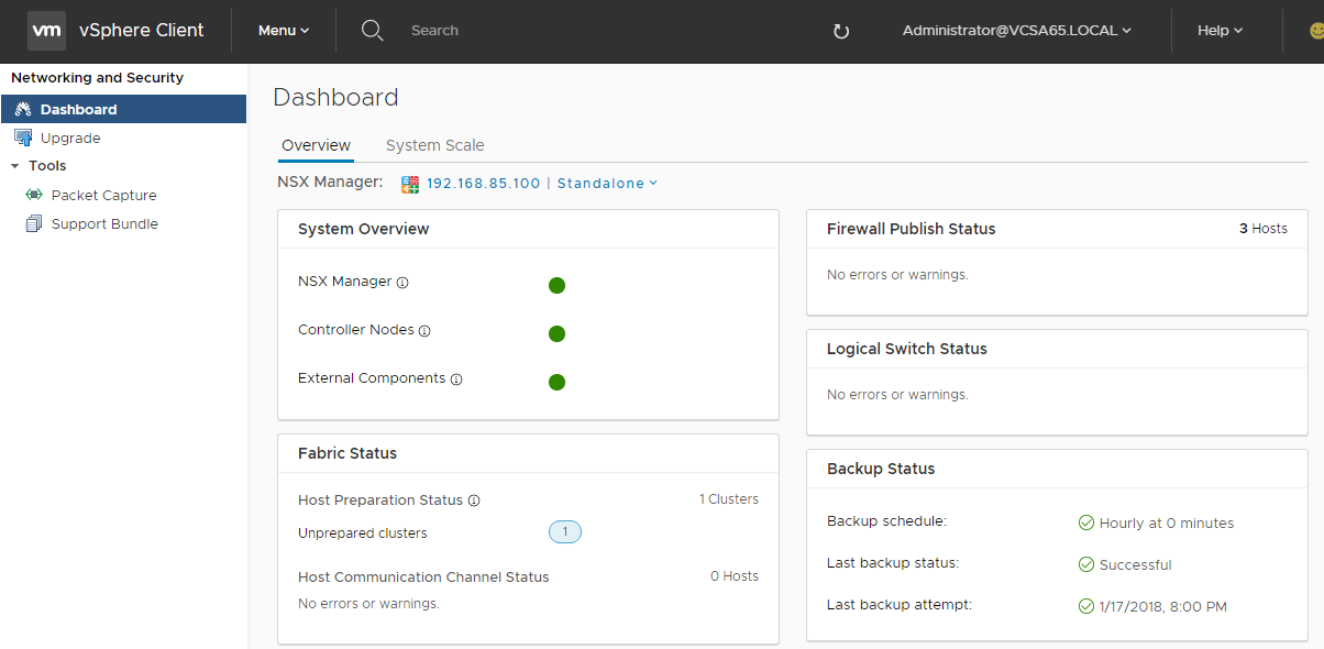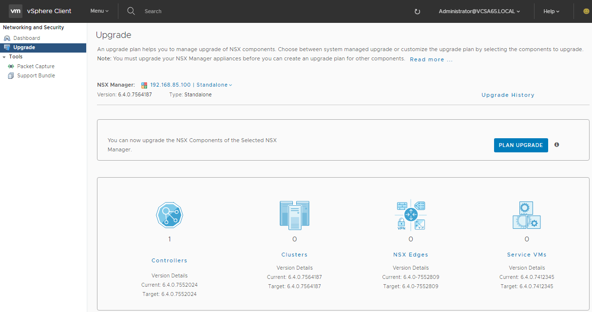 Dashboard > System ScaleUpgrade 6.4.0 Jan 2018 All functionality Tools: Packet Capture 6.4.0 Jan 2018 All functionality Tools: Support Bundle 6.4.0 Jan 2018 All functionality - Upgrade Coordinator – New with NSX 6.4 is the “Upgrade Coordinator” that provides a simplified single pane of glass view to both planning and executing an NSX upgrade. This includes one-click and custom upgrade plans as well as pre and post upgrade checks.