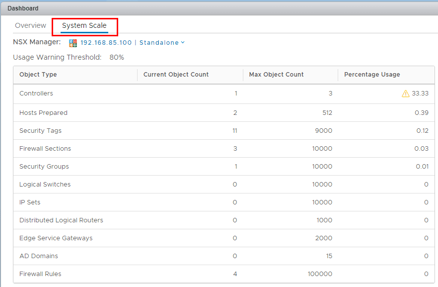 The system scale dashboard is a really great addition to NSX as it allows seeing real time statistics on NSX utilizing and capacity. Are you getting close to limits in the NSX infrastructure? The System Scale dashboard will help administrators easily see if they are nearing any limitations.
