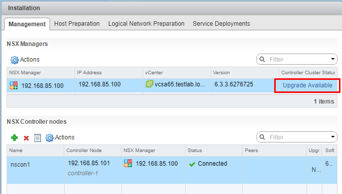 At this point, if we go back out to the Networking and Security menu >> Installation >> Management we will see the Upgrade Available designated.