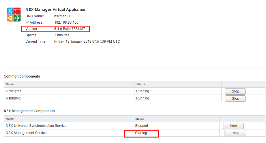 After running the NSX Manager upgrade, the UI will log you out. After logging back in, you should see the new version 6.4.0 Build 7564187 and the services will need to start. They will most likely be in the Starting… state.