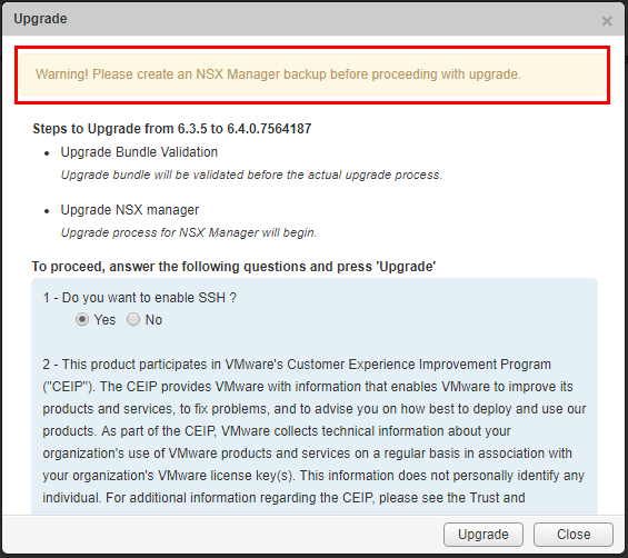 You are directed to perform an NSX Manager backup process before proceeding with the upgrade.