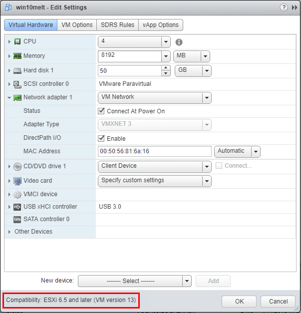 - VMware Compatibility version ESXi 6.5 (VM version 13)