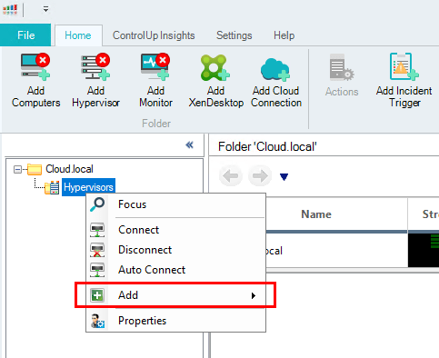 Right-click on the Hypervisors node in the tree and selectย Add >> Hypervisor to begin the Hypervisor Connection wizard.