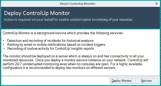 This can be deployed directly from the ControlUp application.ย You select the server you want to install the service on and with the proper credentials you can “push” the service to the server.ย Additionally, you can have more than one ControlUp monitor which is recommended for high availability.