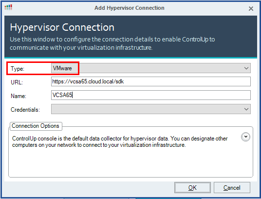 Theย Hypervisor Connection dialog box allows selecting theย Type of hypervisor, andย URLย string for theย SDK connection in VMware.