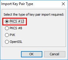 Choose the type of Key Pair Type. We choose the PKCS #12 as the type since this is the type of file we created wit the OpenSSL command line utility.