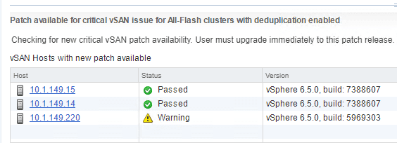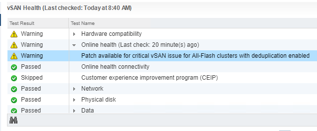 To rewind back to the issue seen in the home lab environment, I had a warning there was a “patch available for critical vSAN issue for All-Flash clusters with deduplication enabled“.