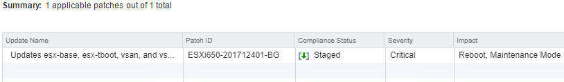 The missing patch shown is the ESXi650-201712401-BG package.
