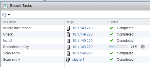 We can watch the update task in vCenter proceed as the patches are applied and the host is rebooted.