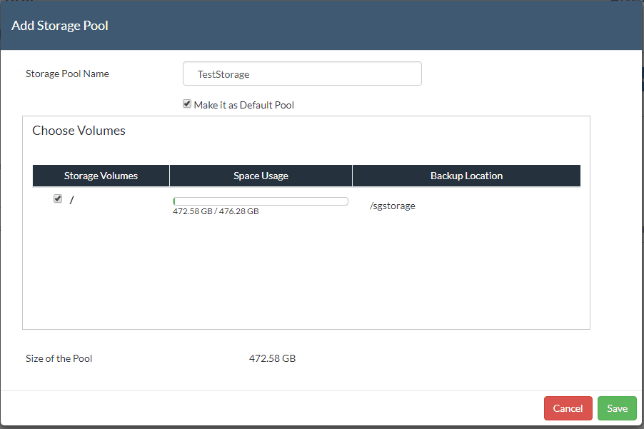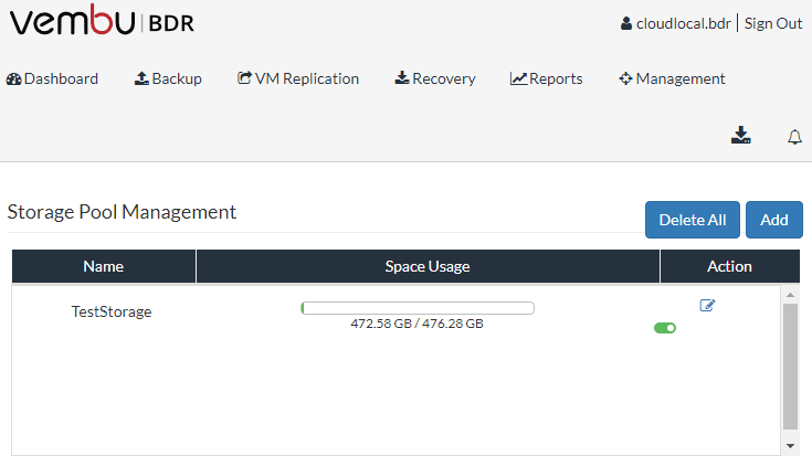 After logging into the Vembu appliance, we need to take the additional step to configure the included storage.ย To do this clickย Management >> Storage Management >> Add to add the preconfigured disk space as storage.ย Name the Storage, and click theย Make it as Default Pool