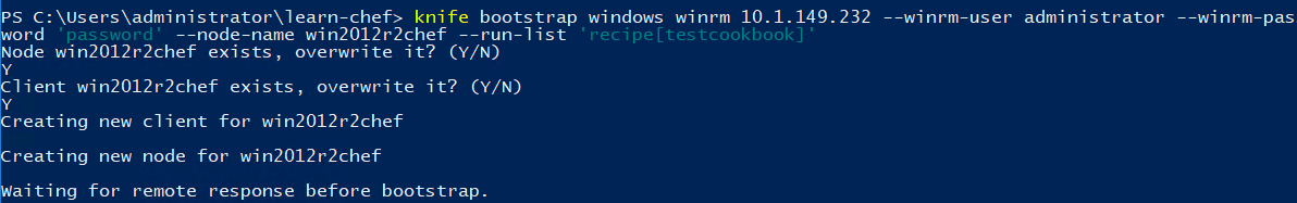 knife bootstrap windows winrm <nodeFQDNorIP> --winrm-user <user> --winrm-password 'password' --node-name <nodefriendlyname> --run-list 'recipe[testcookbook]'