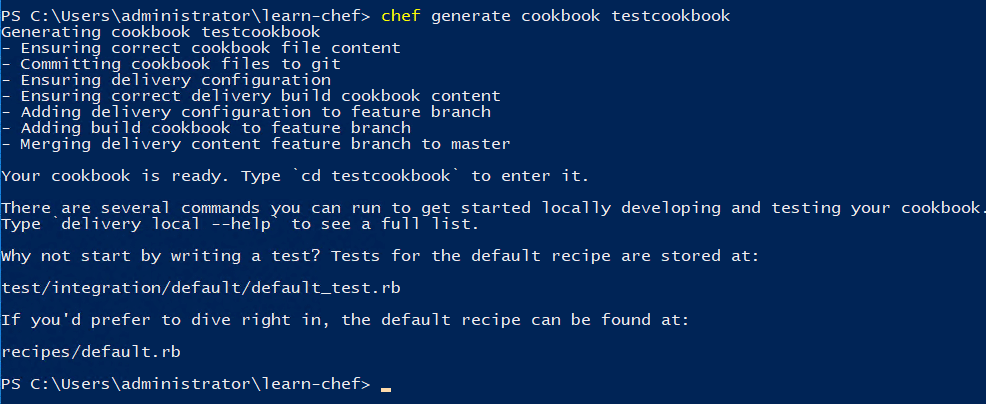 We can create a plain vanilla, blank cookbook without any configuration with the following command from within our Chef Development Kit environment on the workstation.