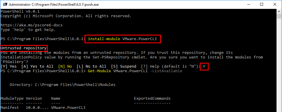 It is amazing how simple installation of PowerCLI 10.0 has gotten with PowerShell Core. Starting with PowerCLI 6.5.1 VMware introduced the module based installation of PowerCLI. This has greatly simplified the installation process of PowerCLI and improved the way the module gets updated as well. As you can see below, it is basically a PowerShell one-liner to get PowerCLI installed.