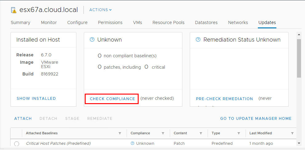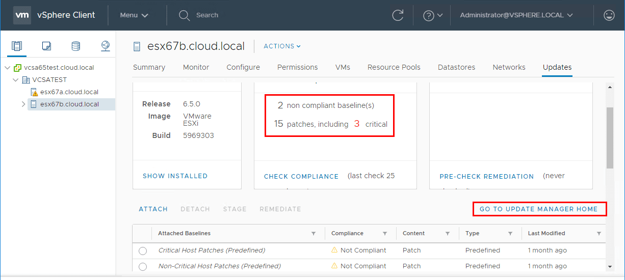 Switched gears below since there are no patches as of yet for ESXi 6.7. I added in an ESXi 6.5 host into the infrastructure, attached the baselines, and ran the Check Compliance operation. Notice I now have patches displaying that can be remediated. A point to note also, you have the link Go to Update Manager Home button that takes you to the Update Manager Home location where you can add images, etc.
