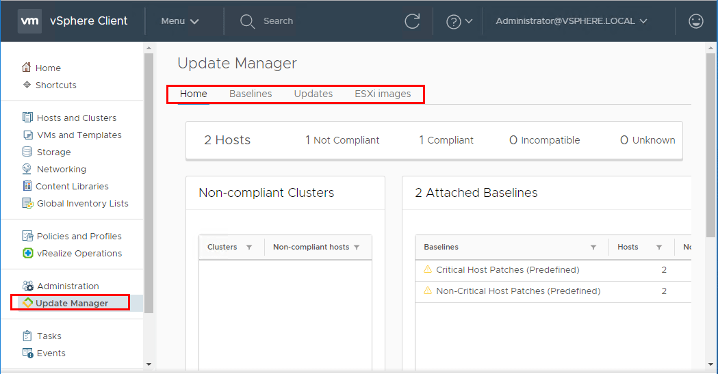 After navigating to the Update Manager Home location. Note the Baselines, Updates, and ESXi Images tabs.