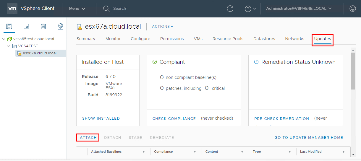 Navigating the new HTML5 vSphere Update Manager functionality. Below, clicking on a host then clicking the Updates tab. Notice the familiar actions however with the Attach button ready to attach an updates baseline.