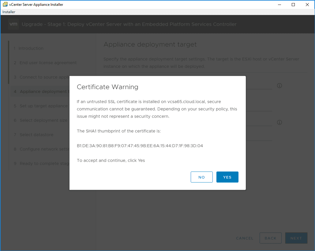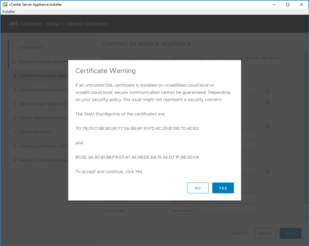 Again, here you will see a certificate warning with self-signed certificates on the destination vCenter Server.