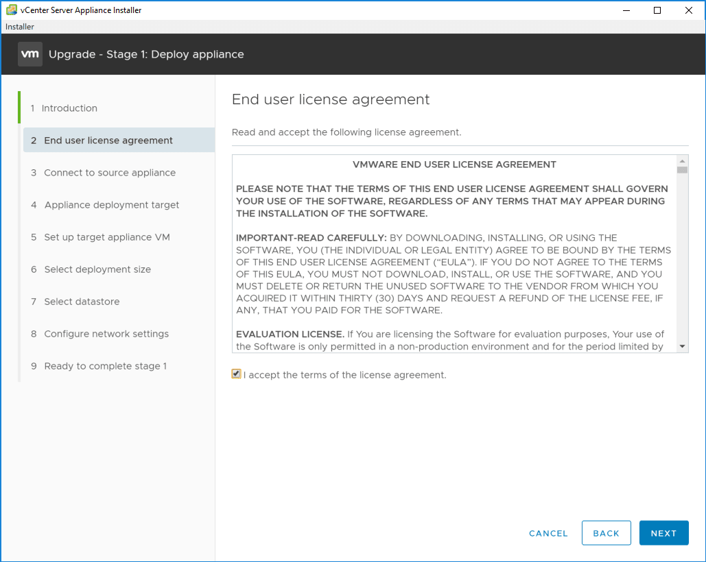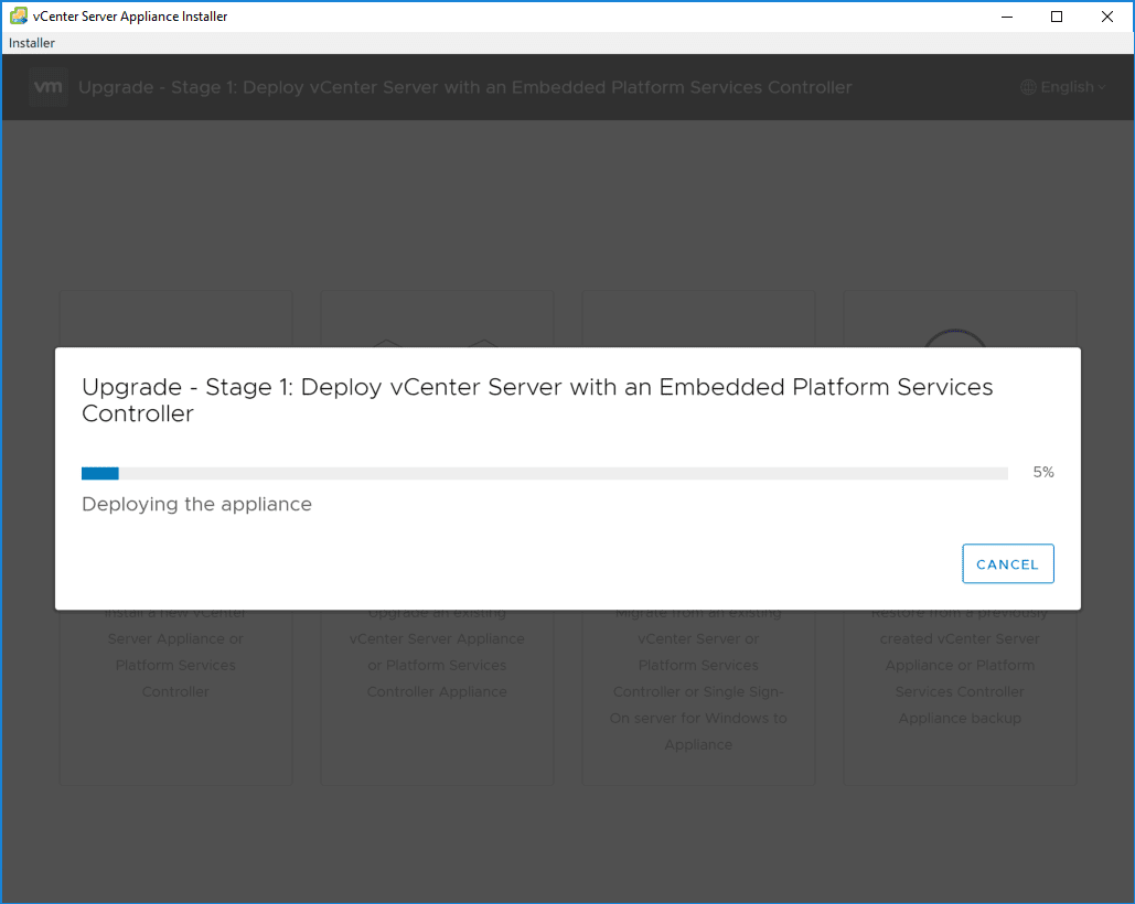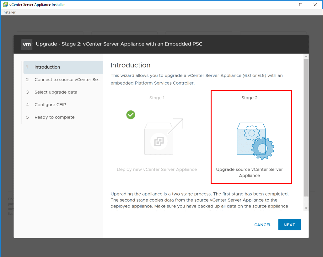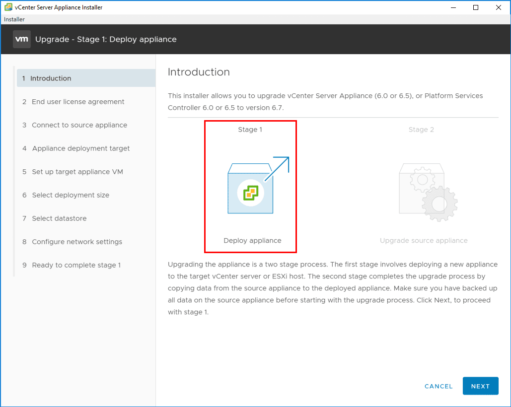 - Upgrading the appliance is a two stage process. The first stage involves deploying a new appliance to the target vCenter server or ESXi host. The second stage completes the upgrade process by copying data from the source appliance to the deployed appliance. Make sure you have backed up all data on the source appliance before starting with the upgrade process.