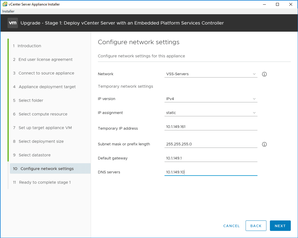On the Configure Network Settings screen, select the network vSwitch you want to use as well as the IP address information for a temporary IP address. Remember with the upgrade, the resulting VCSA 6.7 appliance will assume the IP address of the source VCSA appliance once the upgrade process has made it to the point of powering off the source appliance and assuming identity. Here we simply need to provide a temporary IP address to allow network communication to copy over the data from the source VCSA appliance.
