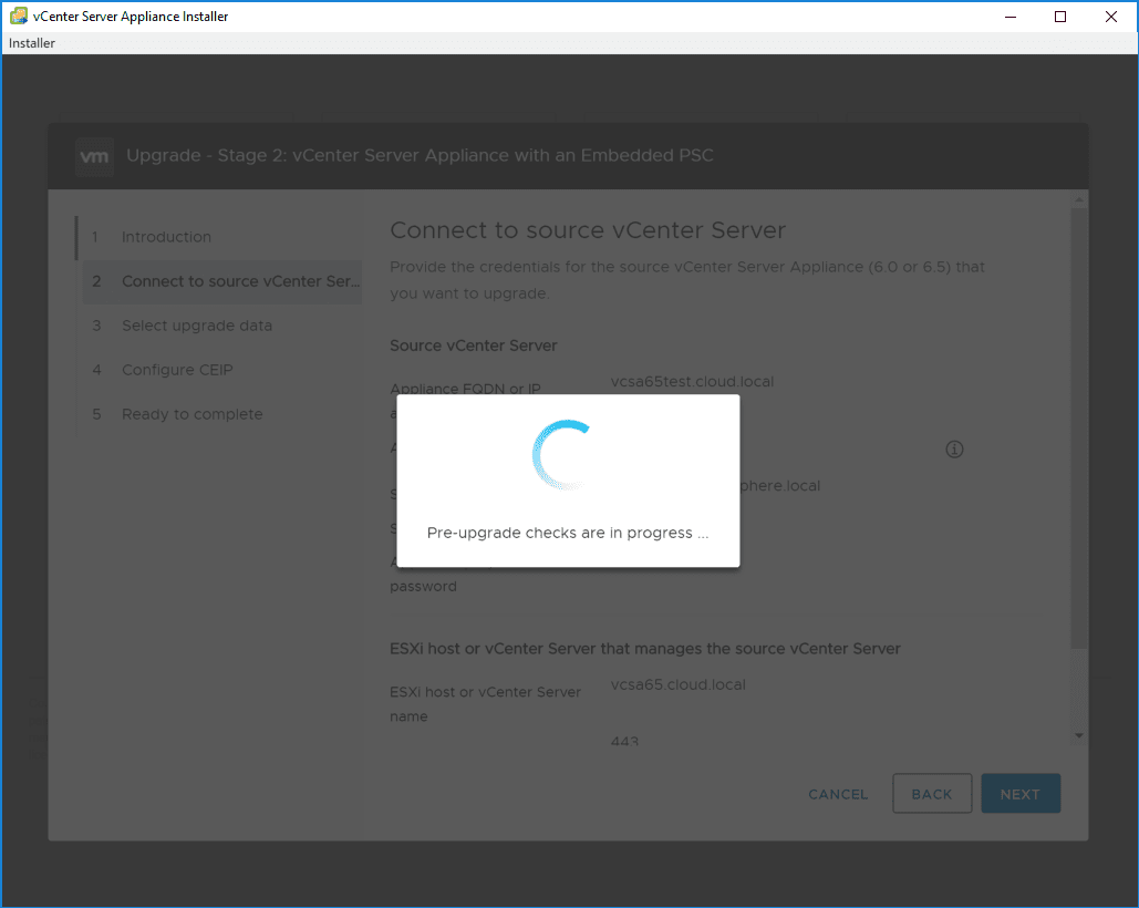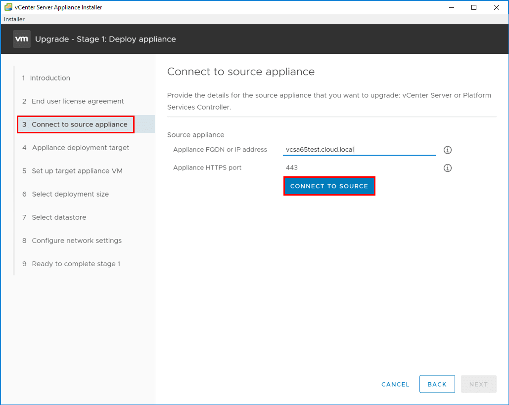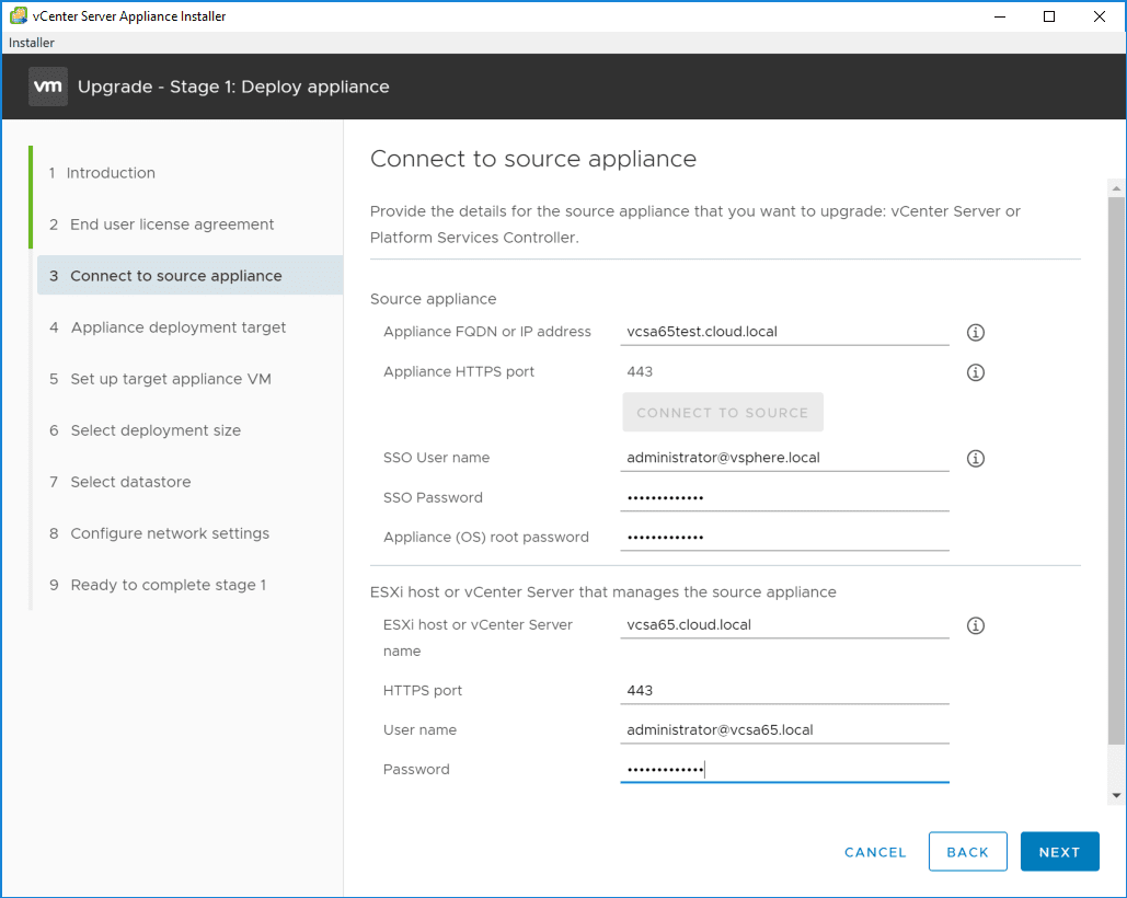 Once you click to Connect to Source, you will provide the login credentials for the source VCSA appliance as well as the login credentials for the ESXi host or vCenter Server that manages the source appliance.