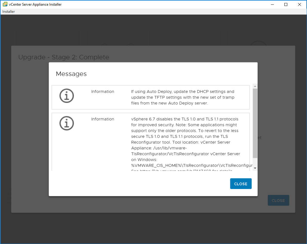 After the third step finishes, you will see a Messages box that shows some reminders after the upgrade finishes, including TFTP settings with Auto Deploy and new TLS standards with VCSA 6.7.