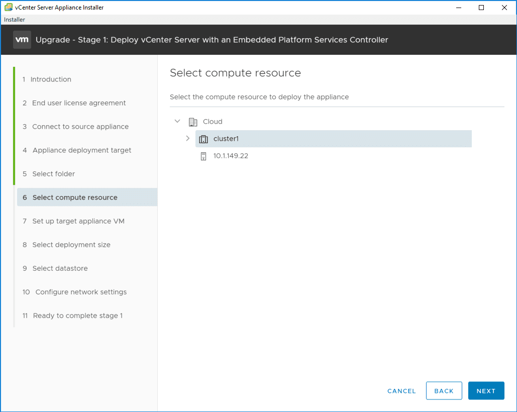 Select the compute resource on which to deploy the new VCSA 6.7 appliance.