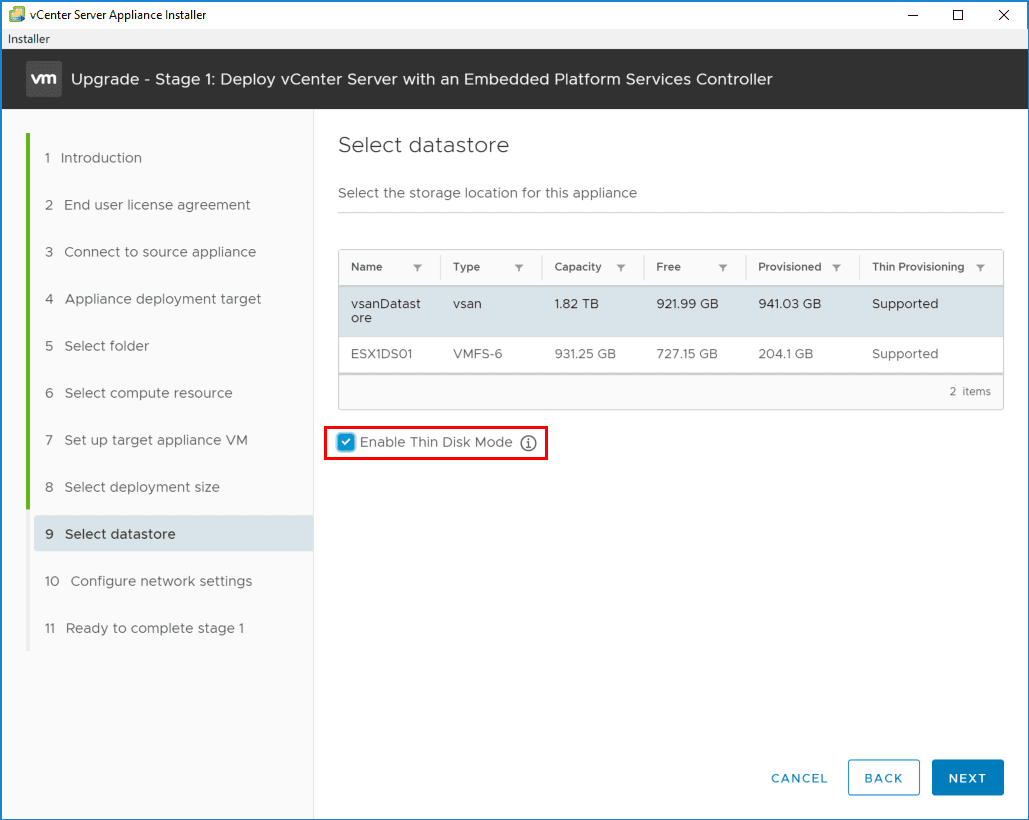 Next, we select the target storage for the destination VCSA 6.7 appliance. Also, you have the option on this screen to enable the Thin Disk Mode for thin provisioning the VCSA 6.7 appliance disks.