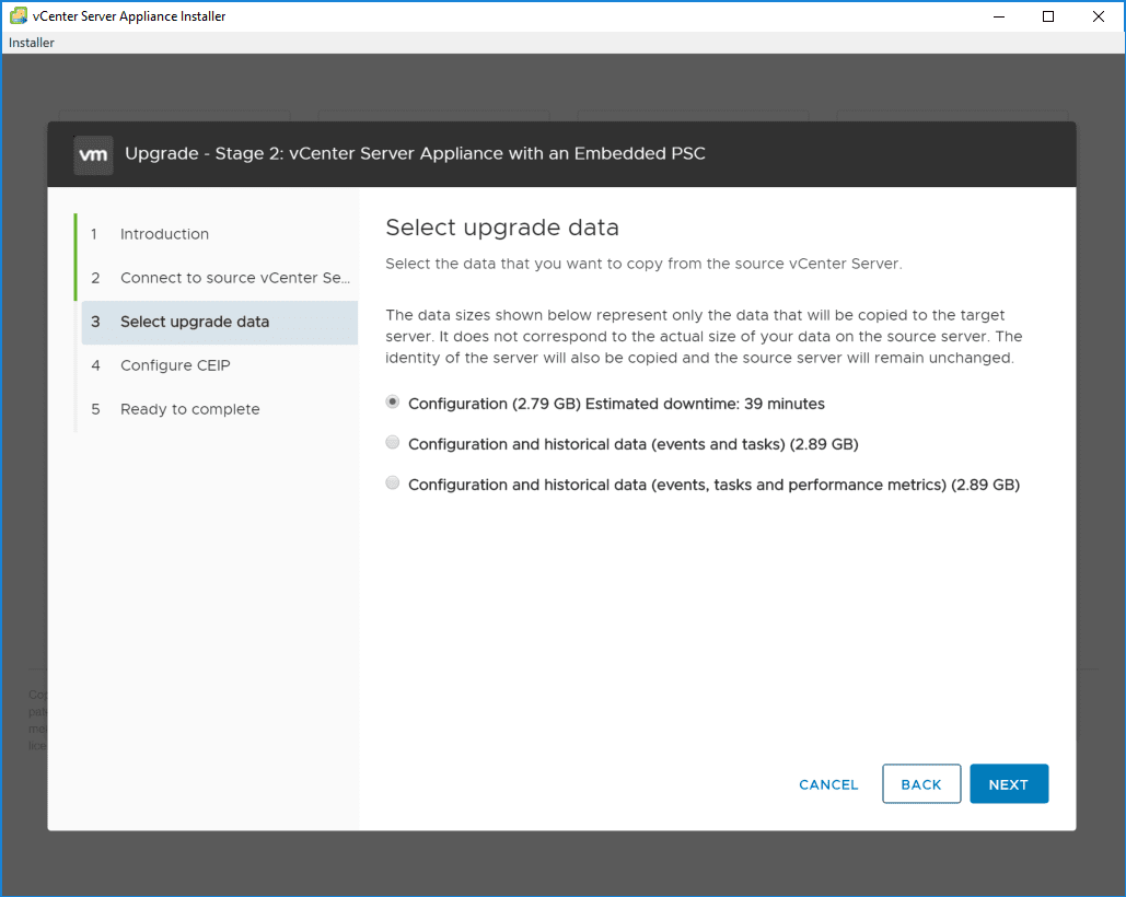 On the select upgrade data screen, you select the data you want to copy from the source VCSA appliance. The options are: