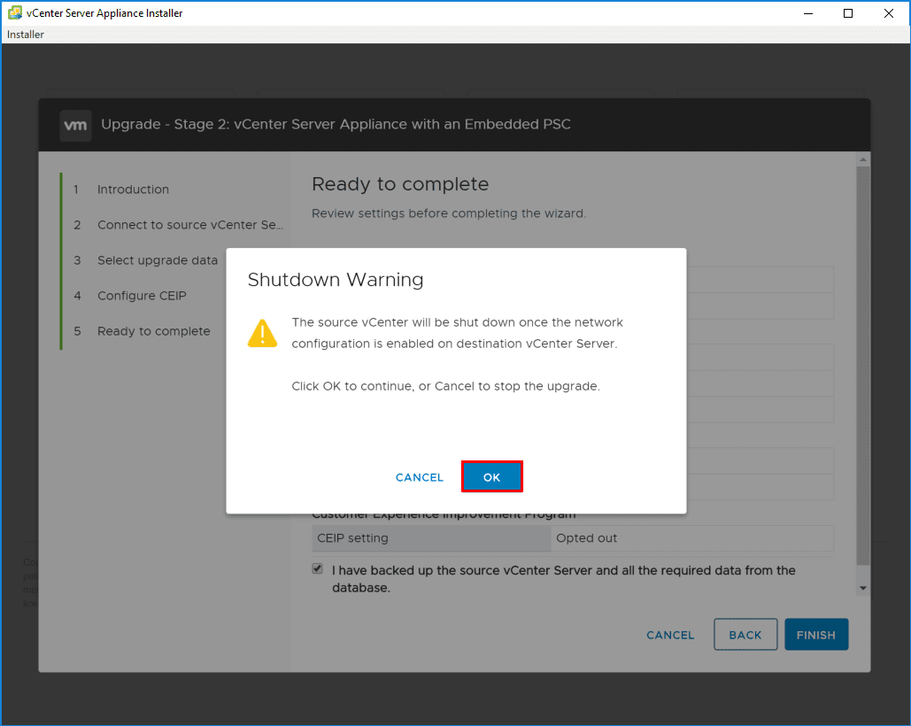 There will be a Shutdown Warning displayed to notify you that the source vCenter will be shut down once the network configuration is enabled on the destination VCSA 6.7 appliance.