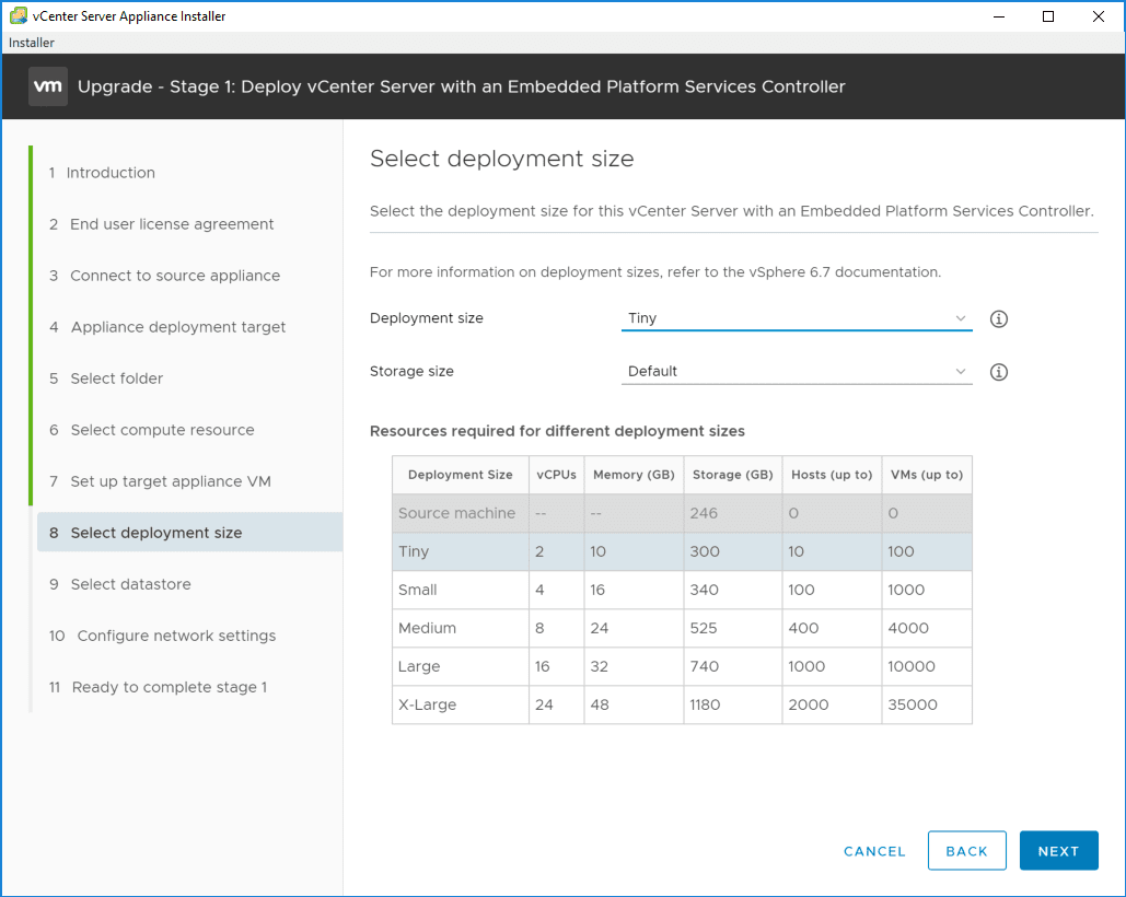 Similar to VCSA 6.5 deployment, you can plainly see the deployment size options. Here for home lab purposes, we are deploying the Tiny deployment.