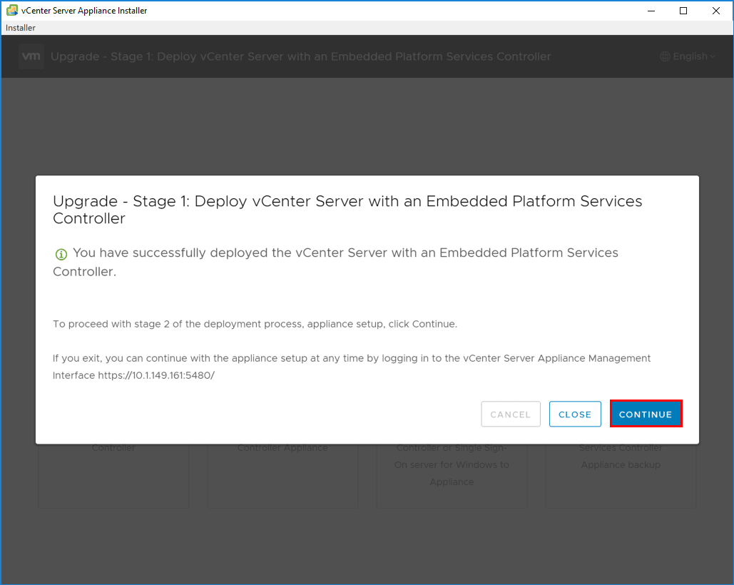 The Stage 1 process will eventually complete after the appliance is provisioned. Click Continue to proceed forward with Stage 2.