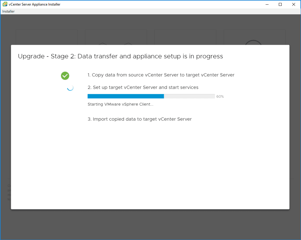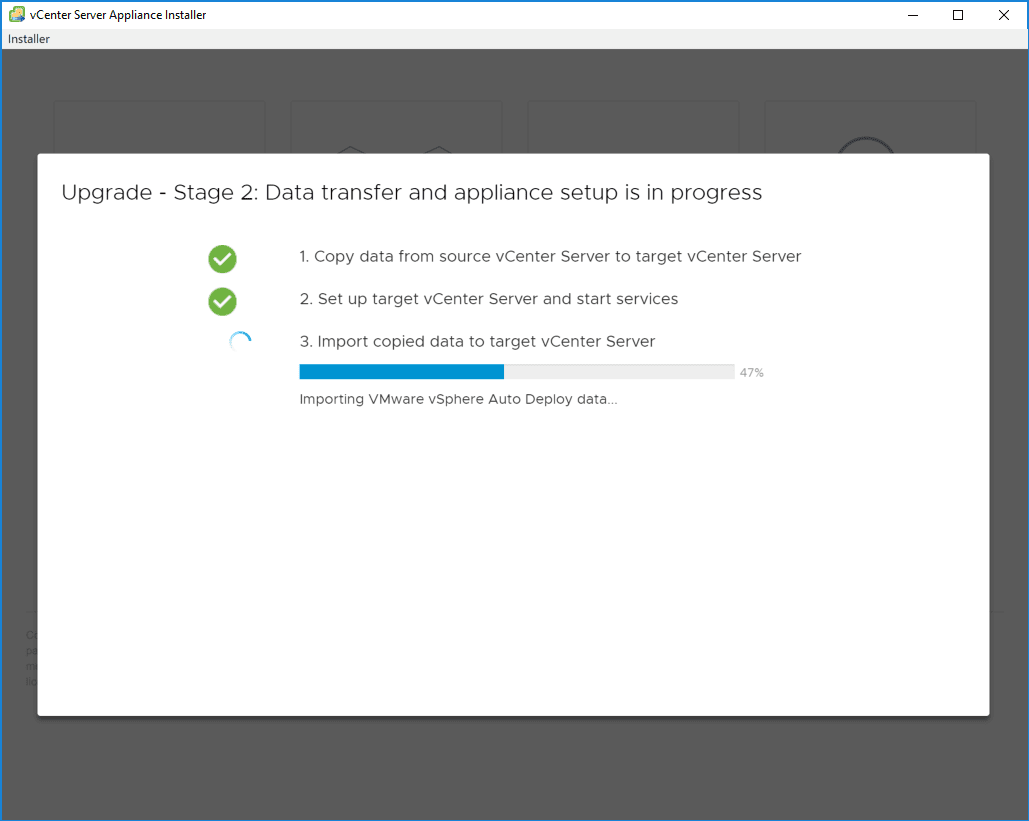 The process to upgrade to the VCSA 6.7 appliance involves a two stage process as described by VMware in the installer: