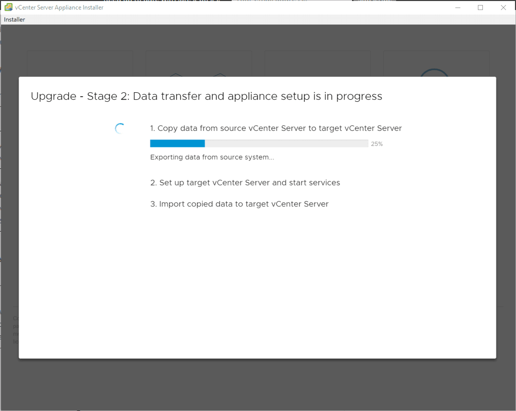 Stage 2 copies data from the source vCenter Server Appliance to the deployed appliance as explained by the installer introductory screen.