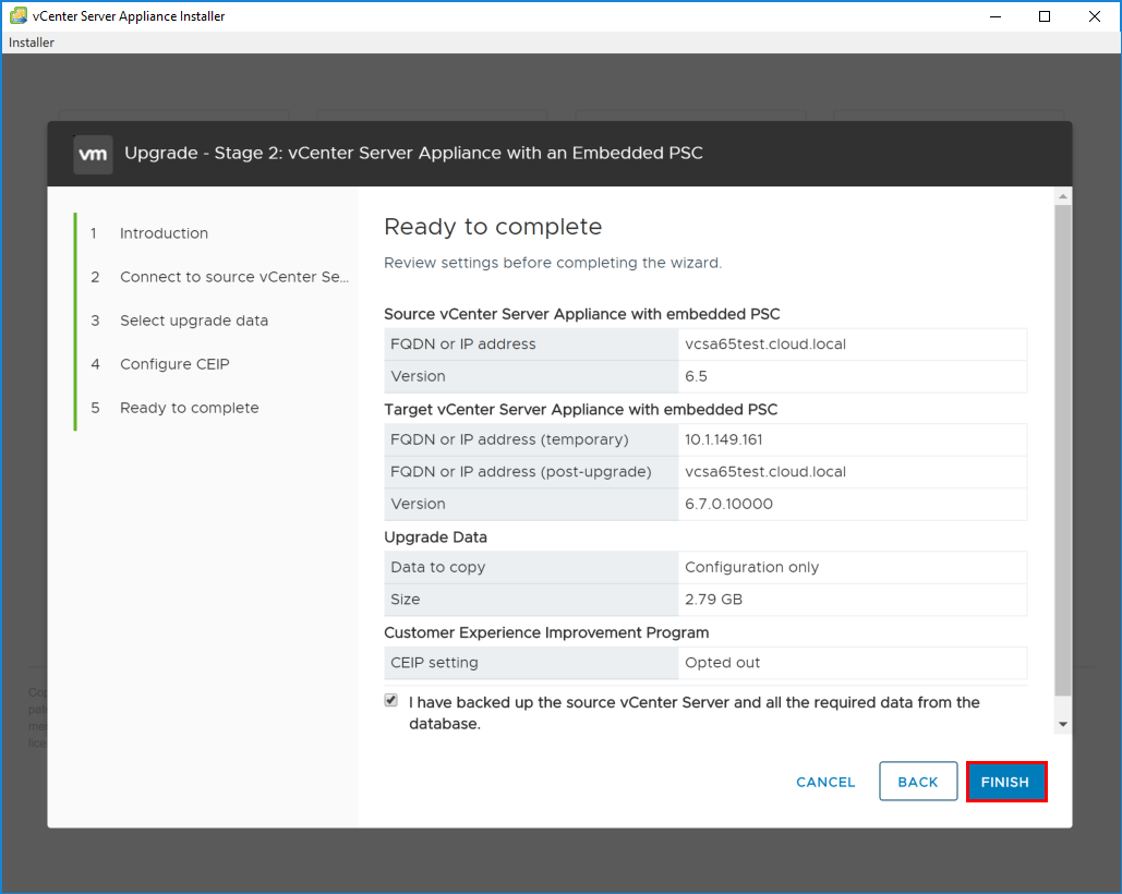 Stage 2 is ready to complete. Be sure to backup your source appliance data. Check the box and then click Finish.