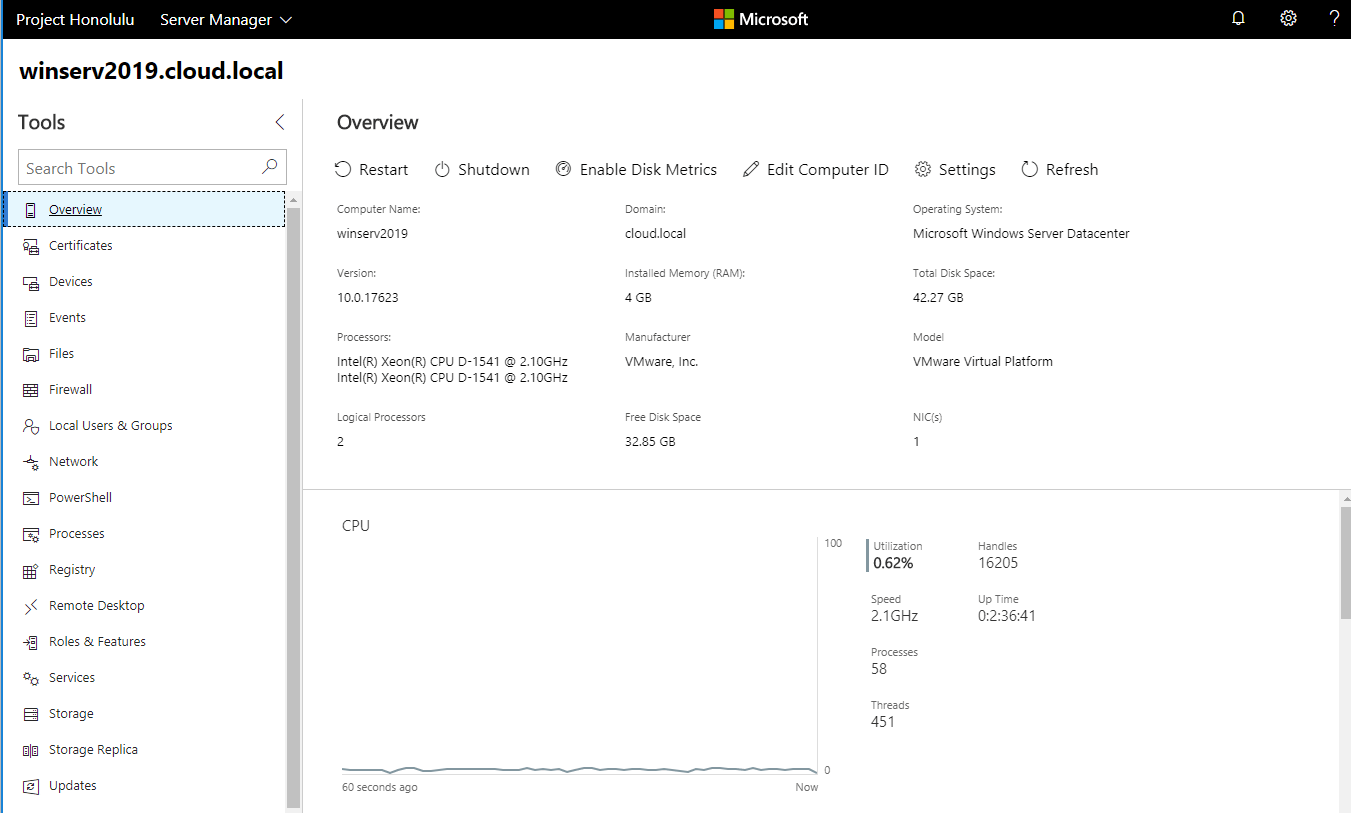 If you have not seen the Project Honolulu dashboard, it provides a really beautiful interface to managing Windows server.ย I really like the intuitiveย Overview component to the dashboard, that gives a high level view of performance metrics and Windows Server 2019 health.