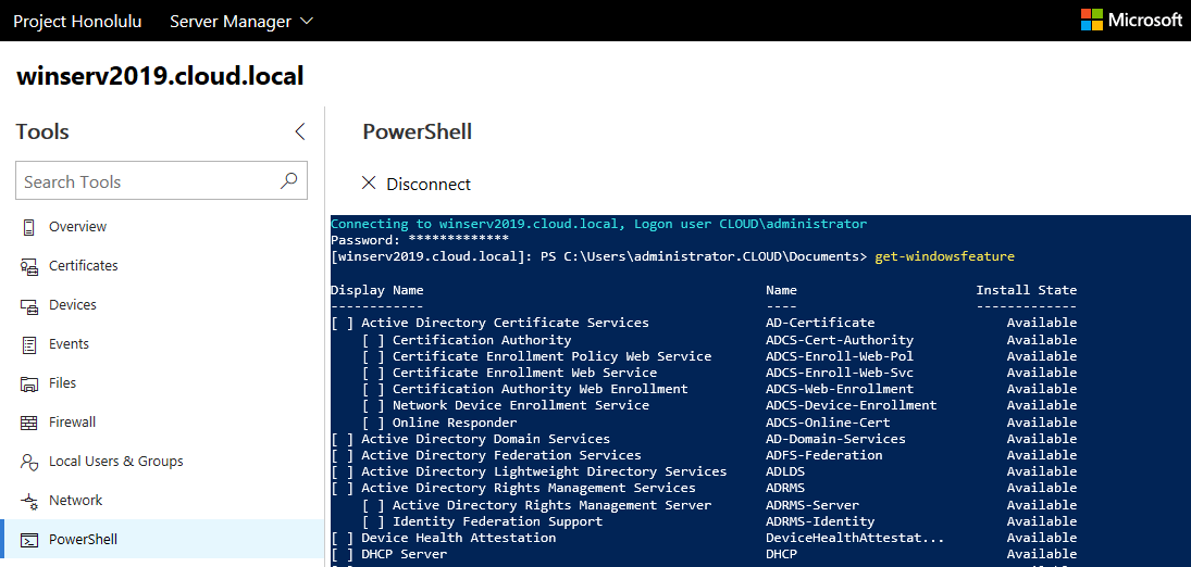 You can useย Edge (I know) to connect successfully to a remote PowerShell session with Project Honolulu.ย Below we are using the commandlet to get the installed Windows features.