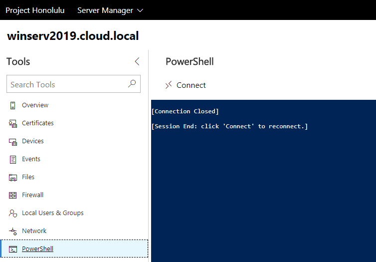 The really great thing about Project Honolulu is that it has PowerShell access built right into the GUI of the interface.ย We can use the PowerShell menu to connect to our Windows Server 2019 server.ย However, an issue that I ran into that is apparently is a bug with Chrome or a current incompatibility with Chrome is that when you connect to the PowerShell menu, you will see aย [Connection Closed] message displayed.