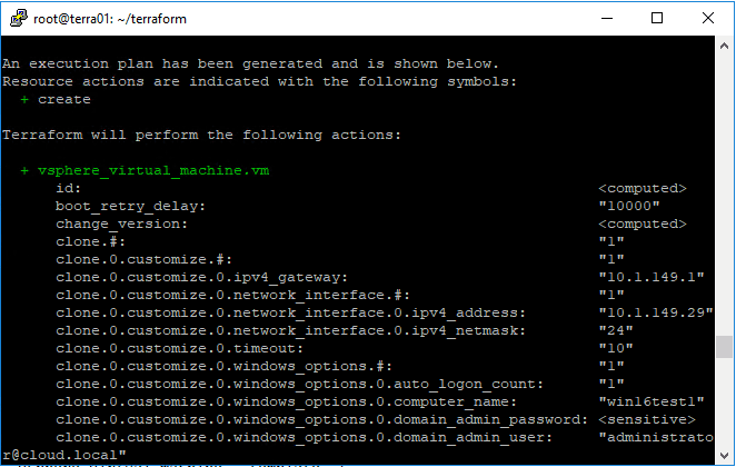 data "vsphere_datacenter" "dc" { name = "Cloud" } data "vsphere_datastore" "datastore" { name = "vsanDatastore" datacenter_id = "${data.vsphere_datacenter.dc.id}" } data "vsphere_compute_cluster" "cluster" { name = "cluster1" datacenter_id = "${data.vsphere_datacenter.dc.id}" } data "vsphere_network" "network" { name = "VSS-Servers" datacenter_id = "${data.vsphere_datacenter.dc.id}" } data "vsphere_virtual_machine" "template" { name = "win16clonetemplate" datacenter_id = "${data.vsphere_datacenter.dc.id}" } resource "vsphere_virtual_machine" "vm" { name = "win16test1" resource_pool_id = "${data.vsphere_compute_cluster.cluster.resource_pool_id}" datastore_id = "${data.vsphere_datastore.datastore.id}" num_cpus = 2 memory = 1024 guest_id = "${data.vsphere_virtual_machine.template.guest_id}" scsi_type = "${data.vsphere_virtual_machine.template.scsi_type}" network_interface { network_id = "${data.vsphere_network.network.id}" adapter_type = "${data.vsphere_virtual_machine.template.network_interface_types[0]}" } disk { label = "disk0" size = "${data.vsphere_virtual_machine.template.disks.0.size}" eagerly_scrub = "${data.vsphere_virtual_machine.template.disks.0.eagerly_scrub}" thin_provisioned = "${data.vsphere_virtual_machine.template.disks.0.thin_provisioned}" } clone { template_uuid = "${data.vsphere_virtual_machine.template.id}" customize { windows_options { computer_name = "win16test1" join_domain = "cloud.local" domain_admin_user = "[email protected]" domain_admin_password = "password" } network_interface { ipv4_address = "10.1.149.29" ipv4_netmask = 24 } ipv4_gateway = "10.1.149.1" } }