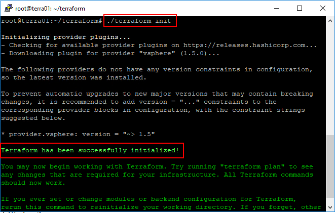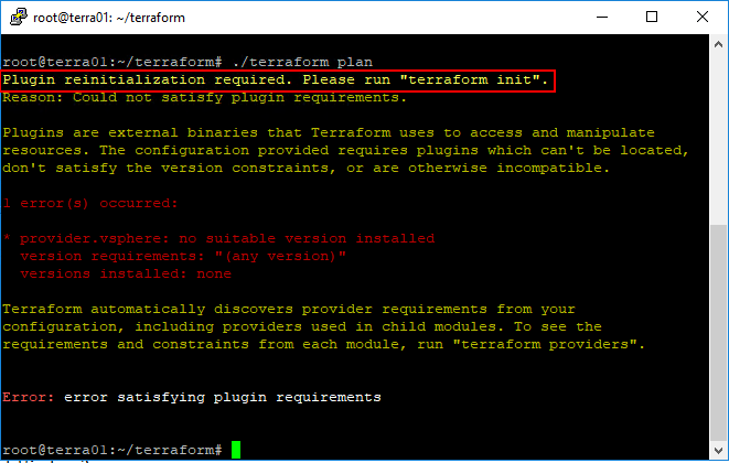 There are a few things that you may run into if you are like me the first go around. Terraform needs to initialize the needed plugins for vSphere, etc. As you can see, after I had my files in place, I simply tried to run the terraform plan command and saw the following error of sorts.