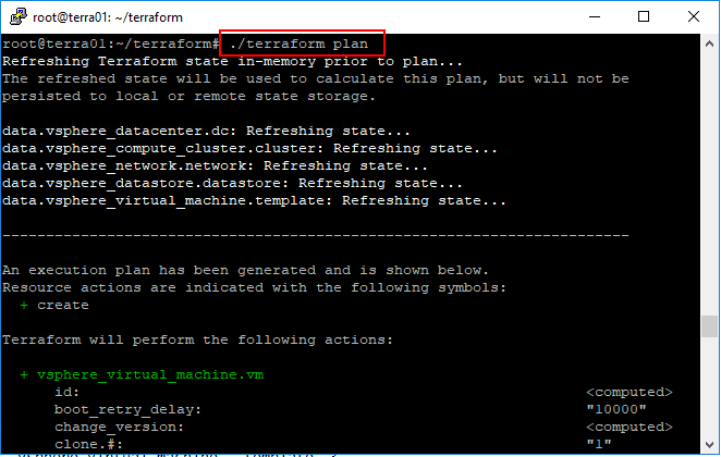 - Run terraform plan – This tests the settings and is basically like running a “whatif” command. This is very handy as it helps to identify errors before applying the declared state.