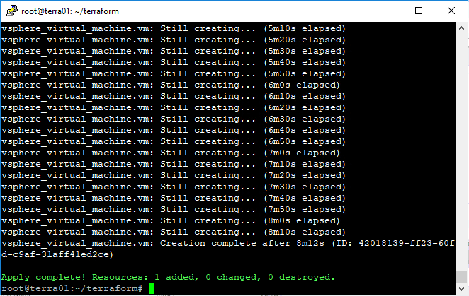 Hopefully this Basic Terraform Installation and VMware vSphere Automation demo shows just how easy it is to setup a simple automation test of cloning a VMware vSphere virtual machine template and then customizing the resulting virtual machine. Terraform is extremely efficient, lightweight, easy to stand up, and versatile. Stay tuned for more in depth posts covering this powerful automation tool. More to come!