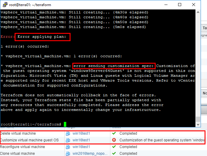 An error – In my first attempt, the clone was successful, but the customization was not. In my case this was an issue with VMware Tools.