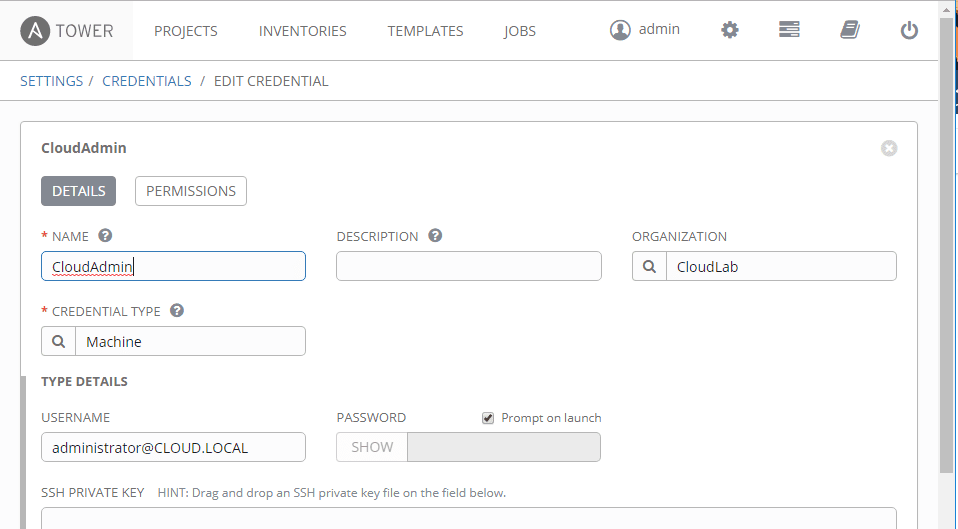 Click the settings cog in the upper right hand corner, and then selectย Credentials.ย Create a new credential configuration as shown below.ย Windows Machines need theย Machine setting forย Credential Type.ย You can save the password or select the checkbox toย Prompt on launch.