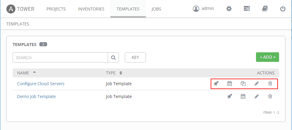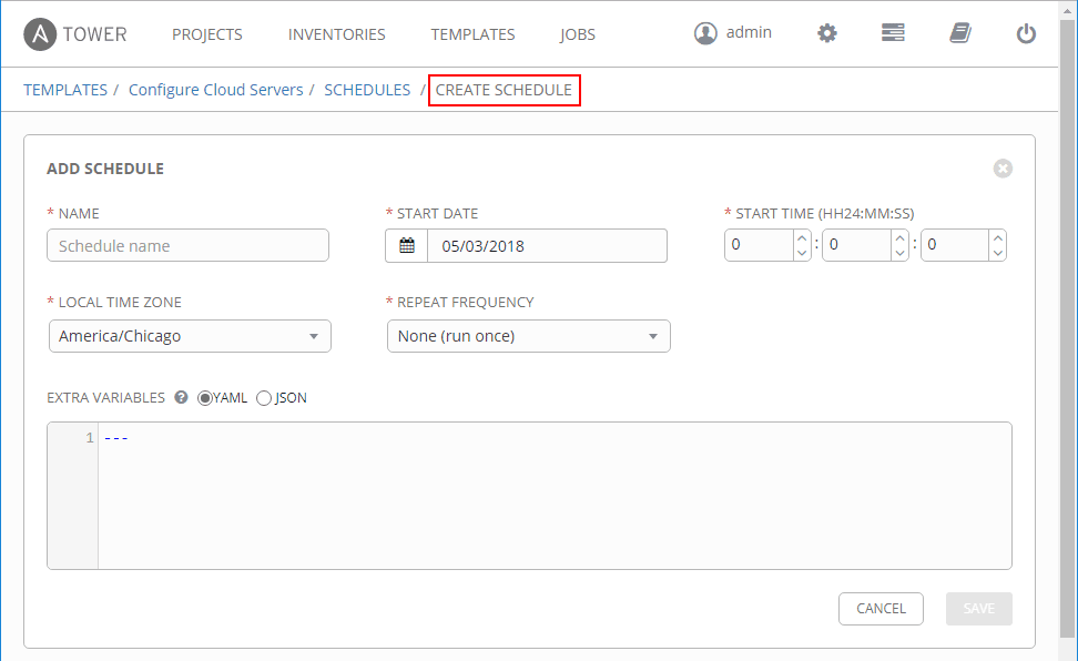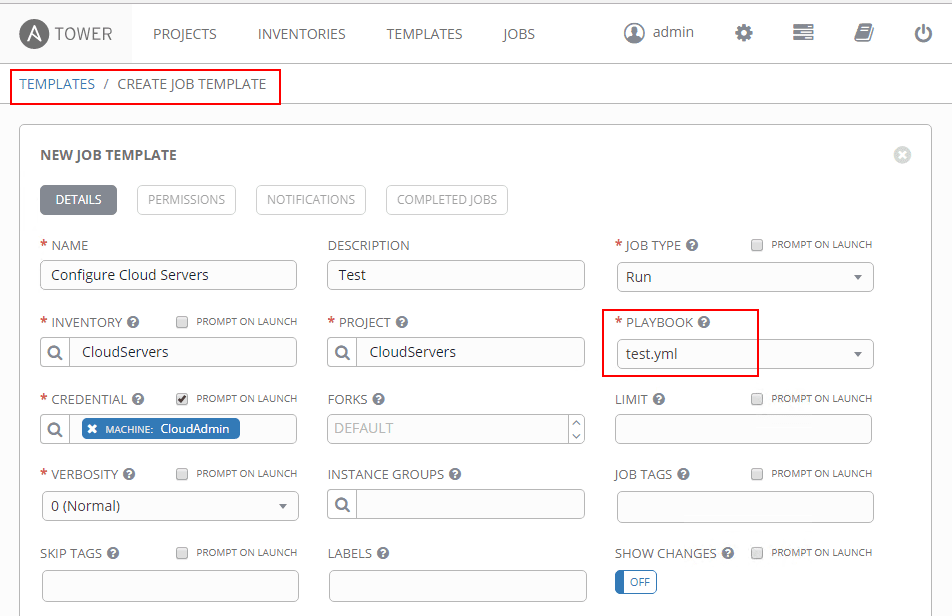 At this point we can create aย Job Template which allows us to specify anย inventory andย playbook and marry those two things together.ย Additionally, Job Templates allow scheduling the job template so the tasks can be run at specified intervals.