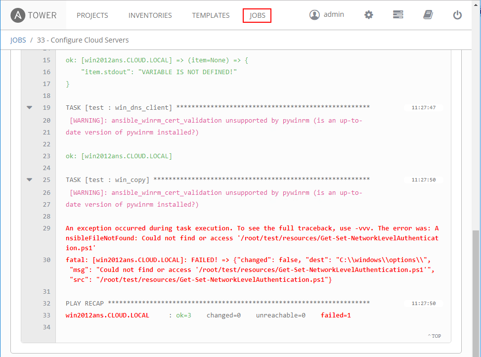 To proceed with this walkthrough of using Ansible Tower to manage and configure Windows servers, you can take a look at the preceding article which used the command line version of Ansible only.ย We will reference the directories created in that post to move forward with Ansible Tower.ย The first thing we need to do is copy our working directory from using the Ansible command line and place the files inside the working directory for Ansible Tower.