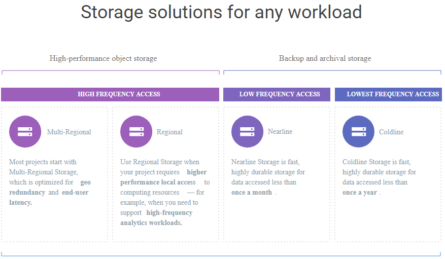 Specifically in relation to storage, Google Cloud Storage provides a unified offering across the availability spectrum.ย This includes ultra quick storage that allows business-critical applications to have access to data quickly, as well as cloud archival solutions that include nearline and coldline storage.ย Google’s Cloud Storage platform provides an API driven interface that allows organizations to programatically control and maintain their Google Cloud Storage solution.