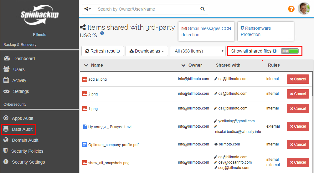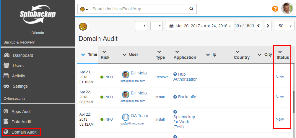 All of the above G Suite modules are found in a “single pane of glass” interface that allows administrators to have complete visibility over the crucial areas of their G Suite environment.ย Recently, Spinbackup announced new features that serve to bolster the already really great data leak and cybersecurity features even further. Three new enhancements were released including:
