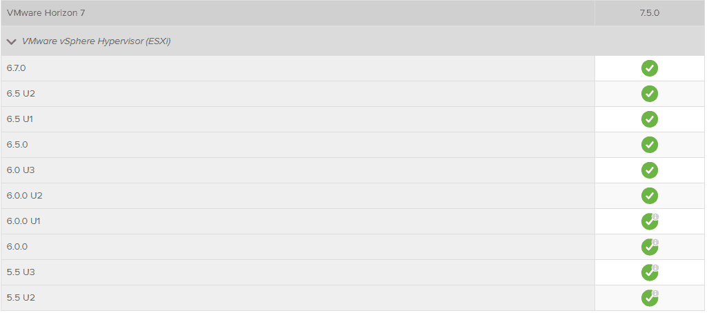 For virtualization software requirements, VMware provides the great resource of the VMware Product Interoperability Matrices that allow quickly finding the supported versions of vSphere products that interoperate with other products.ย For Horizon 7.5, the following ESXi versions are supported.
