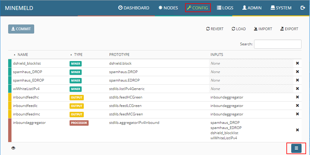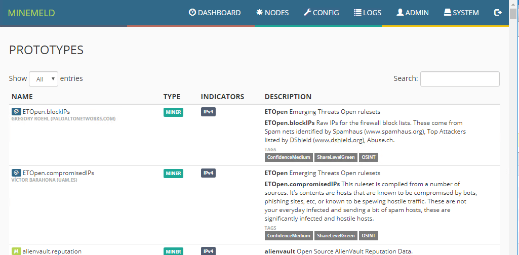 Under the Config menu, you can see and add Prototypes to the MineMeld configuration. Prototypes are new miners that can be imported into the MineMeld configuration. There are tons to be added.
